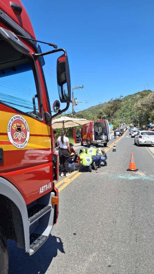 Por volta das 12h, bombeiros do quartel da Barra da Lagoa atenderam um acidente de trânsito em frente à Praia Mole, envolvendo uma motocicleta e um automóvel. O motociclista, um homem adulto, apresentava fratura na perna direita e escoriações, mas estava consciente e com sinais vitais estáveis. Após o atendimento e a imobilização, ele foi encaminhado ao Hospital Governador Celso Ramos pela equipe da ambulância Auto Socorro de Urgência (ASU-541).