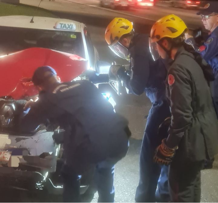 Ao chegarem ao local, os bombeiros realizaram uma avaliação da cena e o gerenciamento dos riscos. Três veículos estavam envolvidos no acidente, no qual constatou-se a presença de um motorista de táxi preso às ferragens do carro. A vítima estava consciente e relatou que sentia dores no peito.
