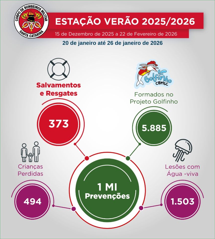 A temporada de verão 2025/2026 está se consolidando como a temporada da conscientização em Santa Catarina. Dados divulgados nesta terça-feira, 27, pelo Corpo de Bombeiros Militar (CBMSC) revelam que o investimento em educação preventiva e a presença ativa dos guarda-vidas resultaram em uma queda drástica nos incidentes com crianças e nos salvamentos em geral.