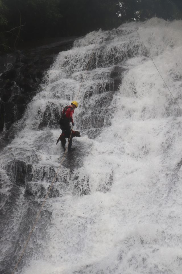 Durante o primeiro dia, foram desenvolvidas instruções de rapel com cães, utilizando cadeirinhas específicas para os animais. As atividades ocorreram em cachoeira, onde todos os binômios executaram com êxito os procedimentos propostos. O treinamento permitiu testar equipamentos, aperfeiçoar a condução segura dos cães em operações verticais e padronizar procedimentos entre as equipes.