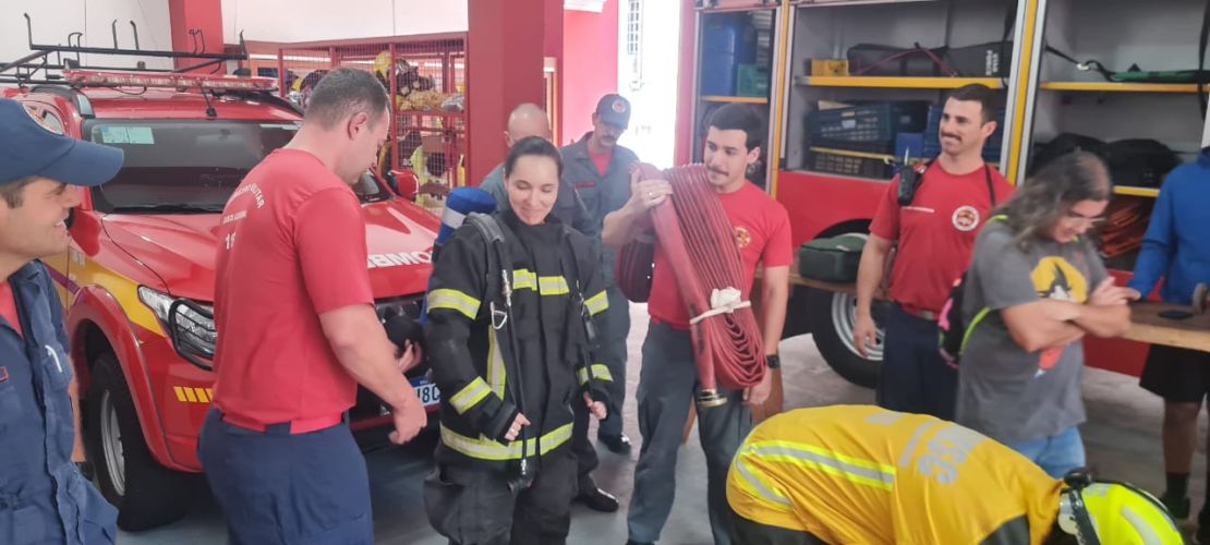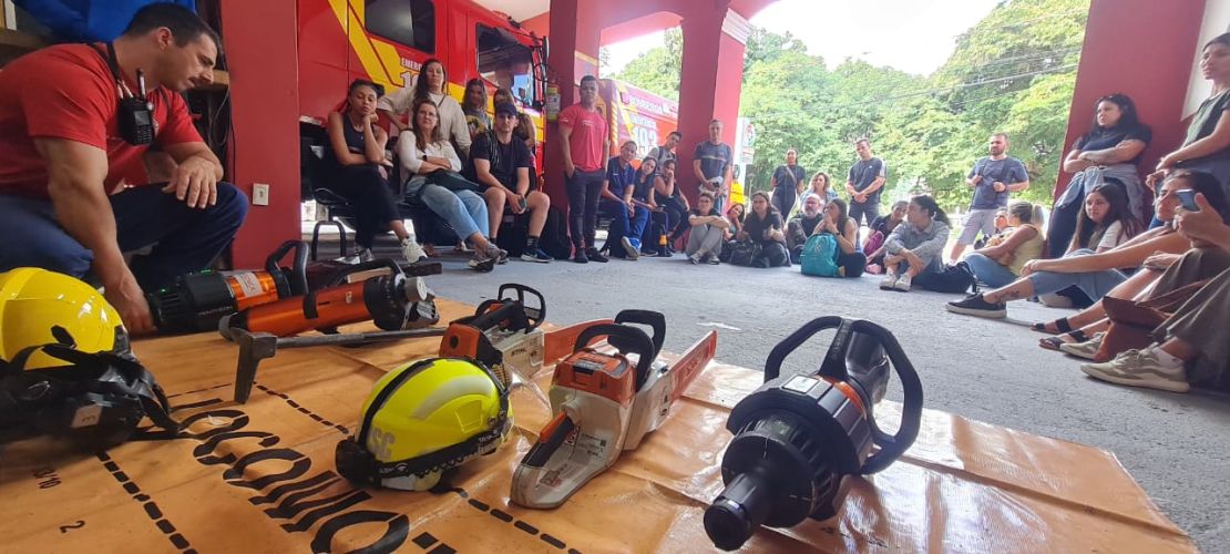 Além da parte teórica, os professores também puderam conhecer e interagir com os Equipamentos de Proteção Individual (EPIs) utilizados pelos bombeiros e acompanhar uma demonstração de ferramentas e técnicas empregadas em ocorrências do dia a dia da corporação.