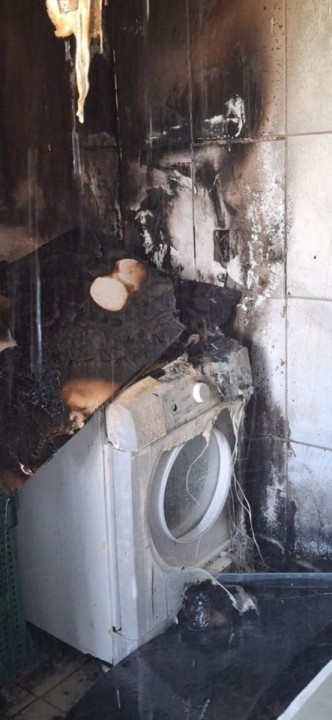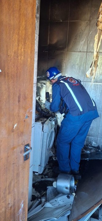 Ao chegarem ao local, as equipes encontraram o início de incêndio parcialmente controlado por extintores, localizado na área de serviço do residencial, com propagação para um cômodo adjacente de aproximadamente 8 m².
