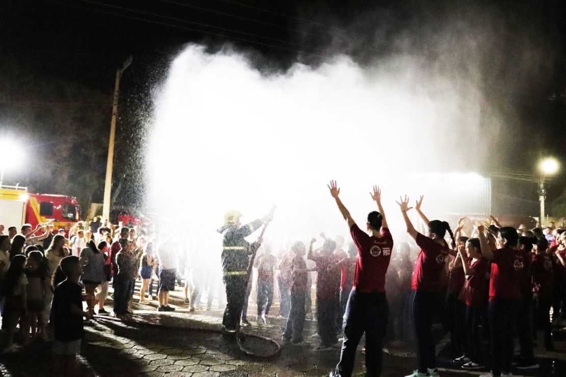Encerrando a noite com muita alegria, ocorreu o tradicional e aguardado banho das crianças, momento simbólico que representa a celebração e integração entre os participantes e os bombeiros.
