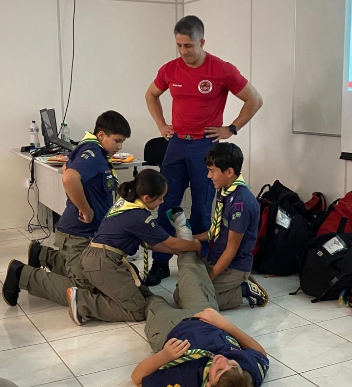 Além disso, os jovens receberam uma breve instrução sobre os procedimentos básicos de Atendimento Pré-Hospitalar (APH). O grupo teve uma pequena demonstração teórica e prática de situações que podem se deparar no dia a dia e tiveram a oportunidade de demonstrar, em oficinas, seus conhecimentos com imobilização e Ressuscitação Cardiopulmonar (RCP). No final da visita, como forma de agradecimento, a escoteira Laura entregou um lenço escoteiro para a guarnição de serviço.