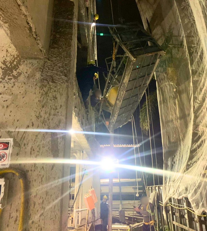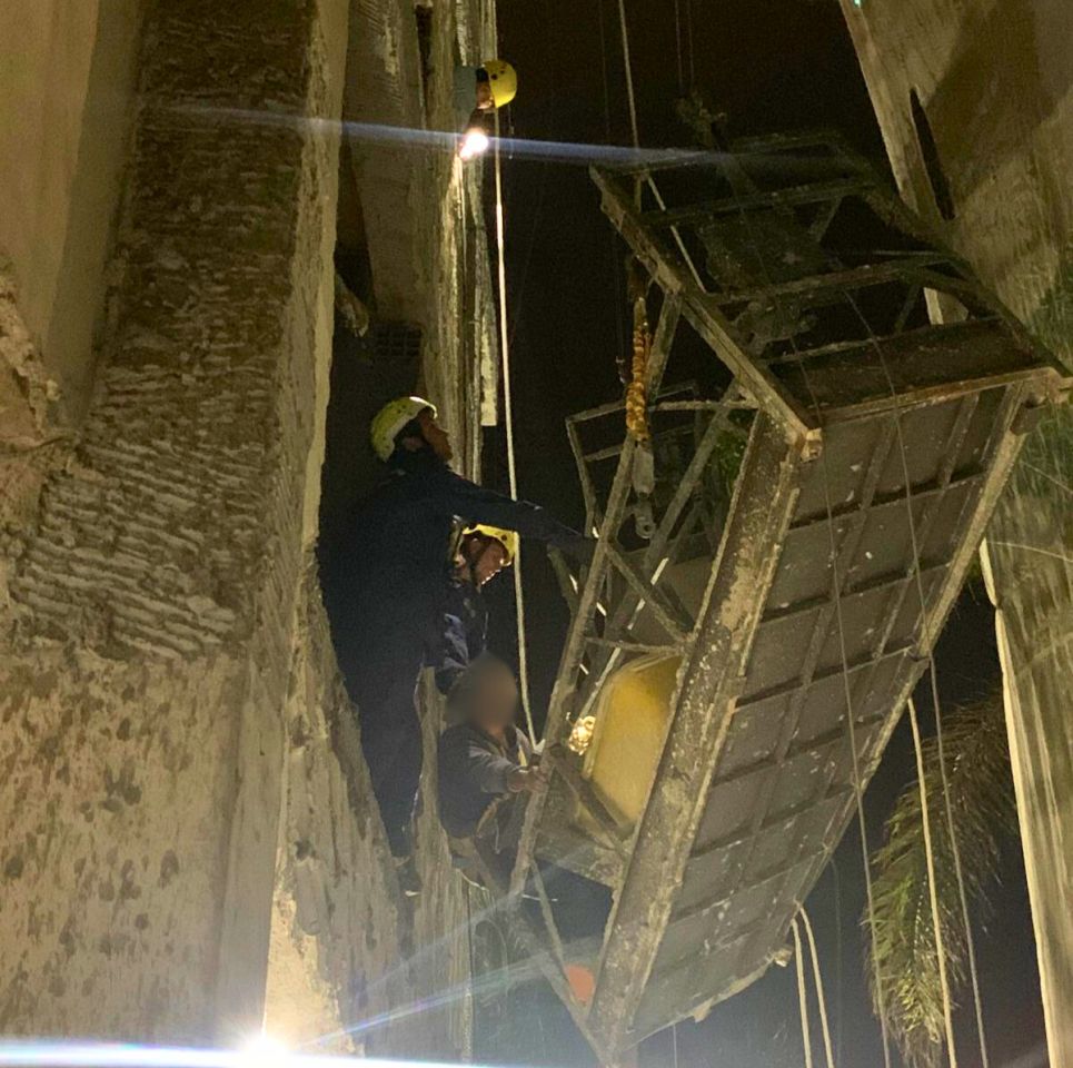 Diante da gravidade da situação, as equipes acessaram a área por meio de uma janela da obra. Um bombeiro realizou a descida em rapel até o ponto de aprisionamento, ancorando e prendendo a vítima para garantir a segurança durante o resgate. Em seguida, foi necessário o uso de ferramentas de desencarceramento para cortar as ferragens, aliviar a pressão no abdômen e liberar as pernas do trabalhador.
