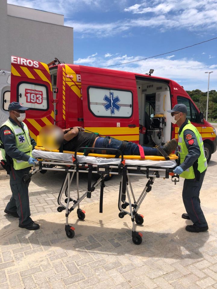Durante o atendimento dentro da ambulância, foram verificados os sinais vitais, constatando-se que o trabalhador apresentava lesões no braço, arcos costais e quadril. Após a estabilização inicial, ele foi encaminhado para avaliação médica em unidade hospitalar.