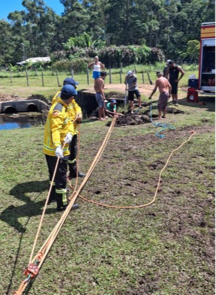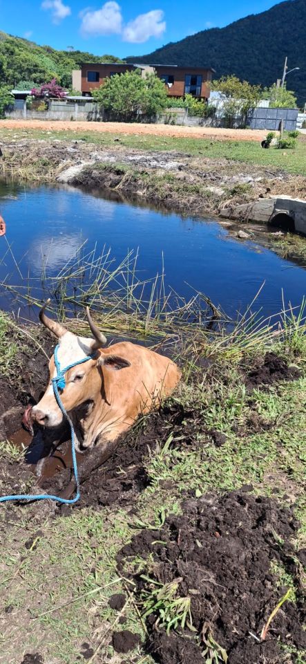 Por volta das 10h30, a equipe do Quartel da Barra da Lagoa, composta por dois bombeiros militares e um bombeiro comunitário, foi acionada para atendimento de uma vaca prenha que havia atolado em um córrego.