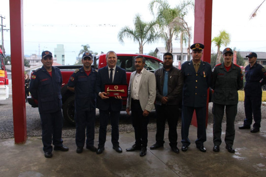 Após a entrega da camionete, foi realizada uma homenagem e entregue uma lembrança ao senhor deputado estadual Maurício Eskudlark, pelo relevante apoio prestado ao CBMSC, especialmente à OBM de Catanduvas.