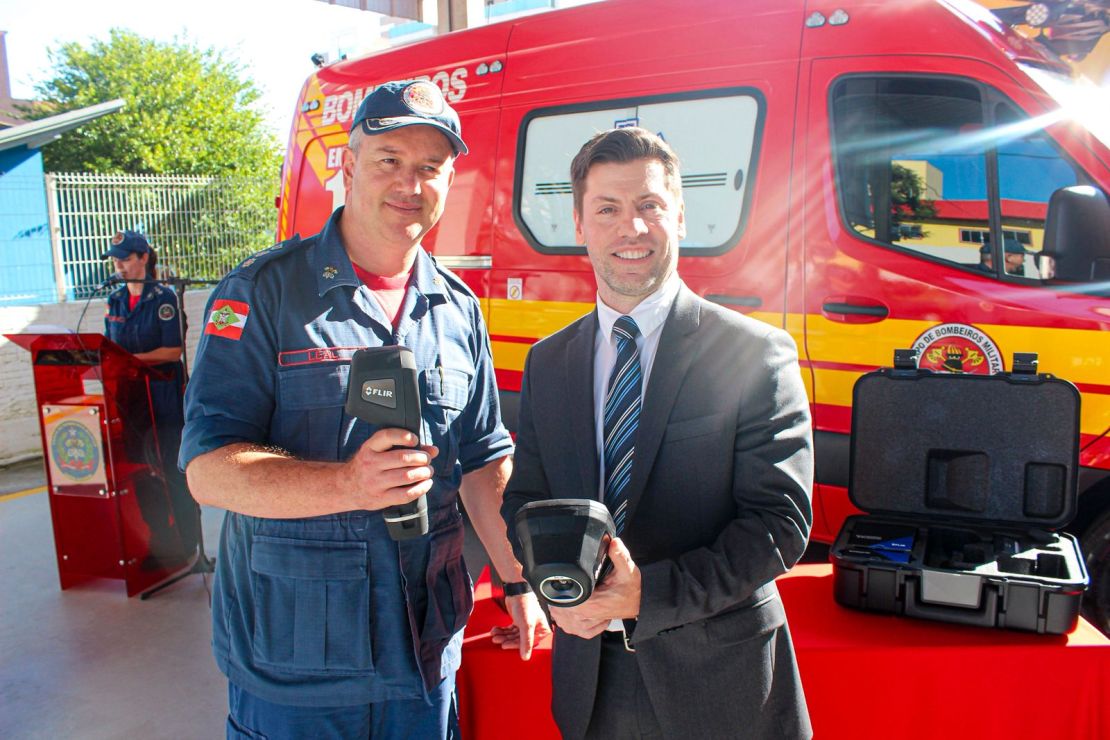 Um dos destaques da solenidade foi a entrega de cinco câmeras de imagem térmica, ferramentas essenciais para ocorrências de combate a incêndio, pois permitem que os bombeiros identifiquem vítimas, focos de calor e riscos ocultos, mesmo em ambientes com fumaça densa ou baixa visibilidade.