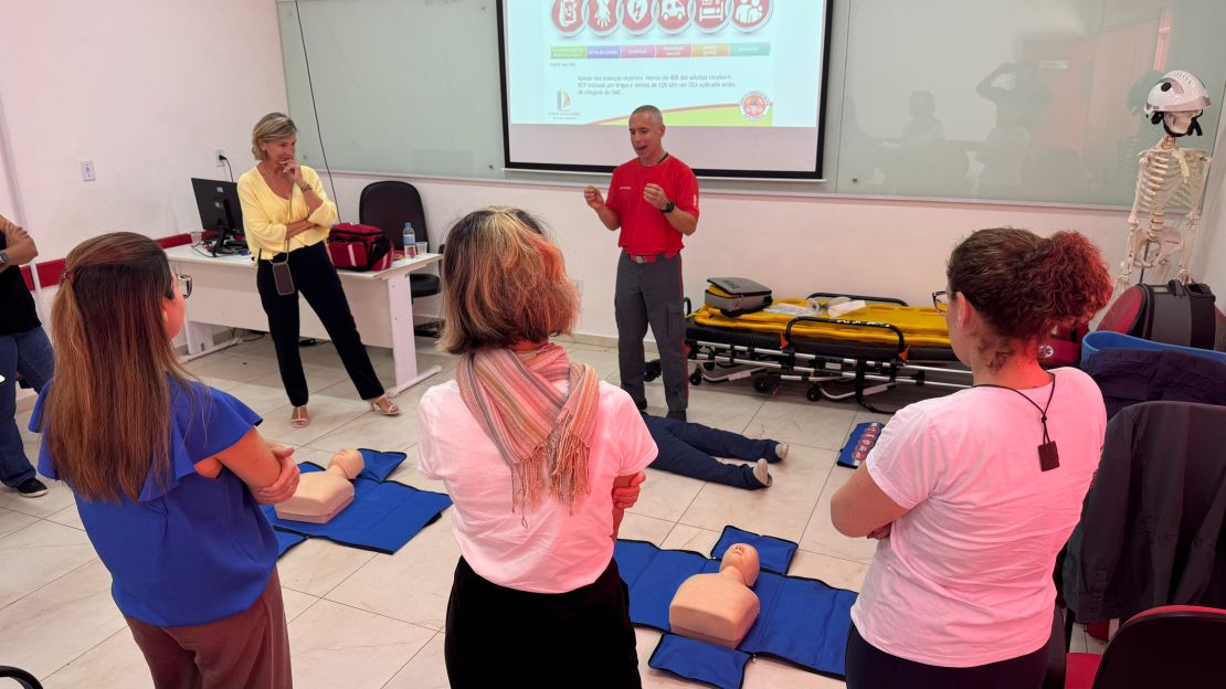 A instrução contemplou técnicas de reanimação cardiopulmonar (RCP), atendimento em casos de obstrução de vias aéreas por corpo estranho (OVACE), contenção de hemorragias, além de orientações sobre combate a incêndio e procedimentos de evacuação em situações de emergência.